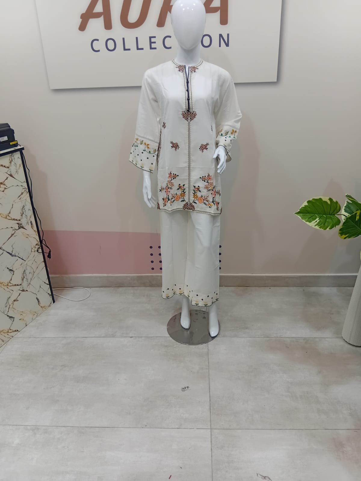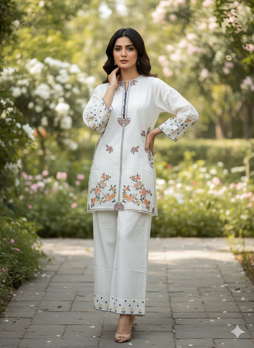 Step into a world of elegance with this beautiful white kurta and palazzos set. Made from high-quality cotton, this outfit is designed for both comfort and style. The classic straight-cut kurta is adorned with intricate, multi-colored floral embroidery along the neckline, sleeves, and hem. The wide-leg palazzos feature a matching embroidered border, creating a cohesive and graceful look. Perfect for casual outings, festive occasions, or a relaxed day, this versatile ensemble pairs beautifully with heels or flats.